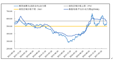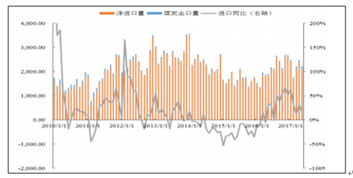目前现货煤价刚刚回到绿色区域,具有金融属性的期货回到绿色区域的低点后反弹,因为期货价格是市场对现货价格的预期。 期货价格触“绿色区间”的下限后反弹意味着该价位是动力煤价格市场预期的底部,同时市场预期现货价格在未来一段时间有走进口煤遇政策严控,全年进口量增幅或将放缓 我国进口煤量 2014 年以前一直呈现增长态势,2015-2016 年连续两年回落,虽然出台了限制进口措施,2016 年在国内煤炭 供应偏紧的背景下仍出现了 25%的增幅,2017 年 1-4 月份煤炭进口量 8949 万吨,增幅更是达到 33.2%,可以认为这是对一 季度国内煤炭供应偏紧的一种反馈。