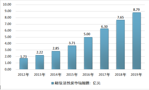 2019年我国超级活性炭市场规模达到了8.79亿元,同比2018年规模7.65亿元增长了14.9%。近几年我国超级活性炭行业市场规模情况如下图所示: