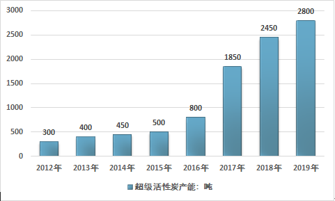同时行业内还存在众多中小企业逐步进入市场,总体而言,近几年,我国超级活性炭行业产能快速增长,从2012年的300吨增长到了2019年的2800吨。近几年我国超级活性炭行业产能情况如下图所示: