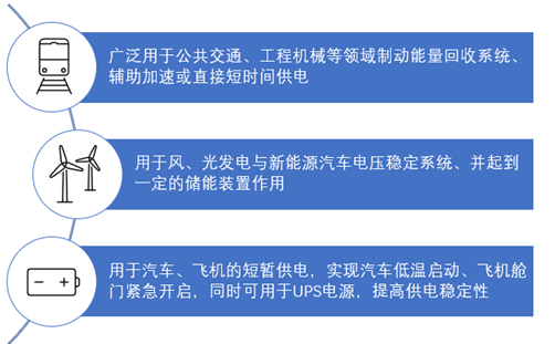 超级电容器是指一种介于传统电容器和充电电池之间的一种新型储能装置,既具有电容器快速充放电的特性,同时又具有电池的储能特性。超级电容器的功率密度高,是锂电池的 30-100 倍,爆发力强,充放电时间短,使用寿命超长,能够可逆充放电 50-100 万次,且具有极佳的超低温特性,具有极为广阔的应用前景,目前广泛应用于高铁、电动车辆、混合动力车辆、有轨电车、电力系统(智能分布式电网系统)、航空航天、电动工具、电动玩具等领域。