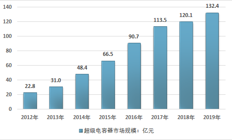 而随着超级电容器技术的成熟,应用领域不断拓展,成熟的应用案例不断增加,行业的市场规模保持稳定增长态势。2019年我国超级电容器行业市场规模约132.4亿元,同比2018年的120.1亿元增长了10.24%。