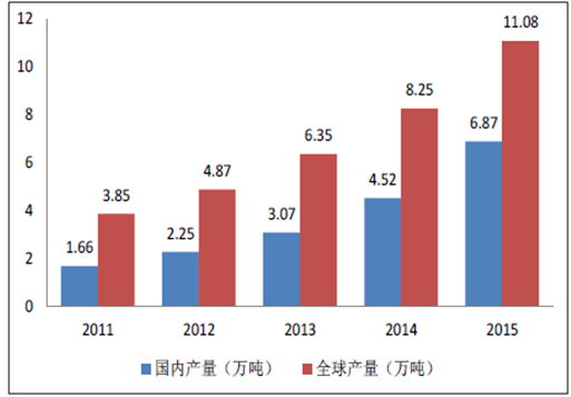 2011-2015国内和全球的电解液产量