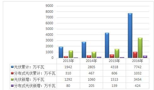 截至2016年底,我国光伏发电新增装机容量3454万千瓦,累计装机容量7742万千瓦,新增和累计装机容量均为全球第一。其中,光伏电站累计装机容量6710万千瓦,分布式累计装机容量1032万千瓦。全年发电量662亿千瓦时,占我国全年总发电量的1%。