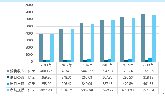 2016年我国配电开关控制设备行业销售收入6721.35亿元,进口金额为318.15亿元,出口金额461.86亿元,市场规模6577.64亿元。