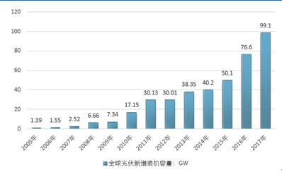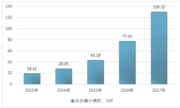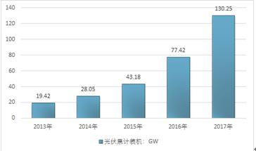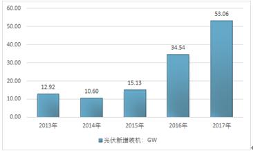2017年,中国光伏发电新增装机为53.06GW,同比增加18.52GW,增速高达53.62%,再次刷新历史高位。此外,2017年的新增装机还是2016年的1.5倍、2015年的3.5倍、2014年的5陪和2013年的4倍,由此可见2017年光伏新增装机出现了大幅快速增长。