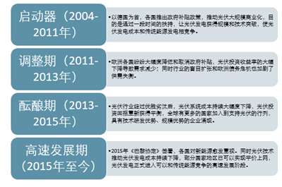 光伏发电技术可以追溯到1839年法国科学家E.Becquerel发现液体的光生伏特效应(简称光伏现象),光伏发电大规模商业应用要从2004年德国率先推出光伏补贴政策开始。自2004年起,光伏行业发展历程可以大致划分为以下四个阶段: