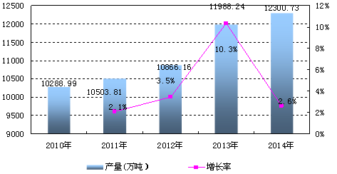 2014年我国中厚宽钢带产量为12300.73万吨,与上一年相比增长2.6%。从近五年的统计数据来看,中厚宽钢带产量呈稳定增长态势,2014年产量达到近几年的最高值。