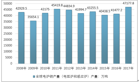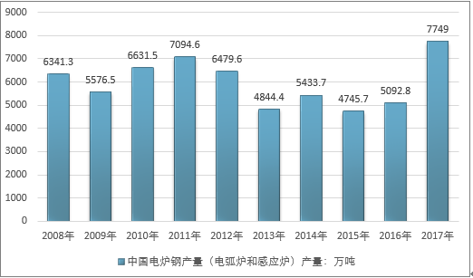 2017年全球电炉钢产量达 4.71 亿吨,我国电炉钢产量 7749 万吨,同比增长 52.16%、占全球电炉钢产量的 16.43%。根据国际钢铁协会统计数据,2017年全球粗钢产量16.91亿吨,其中电炉钢产量 4.71 亿吨,同比 2015 年增长 13.74%;2017年我国电炉钢产量达7749万吨,同比 2016 年增长 52.16%,占全球电炉钢产量的16.43%。从历史统计数据看,2009 年至 2011 年,我国电炉炼钢产量处于上升阶段,至 2011 年达到7094.60 万吨,2012~2016年电炉炼钢产量逐年下降,但同比降幅逐渐缩小。2017年迅猛增长至7749万吨。