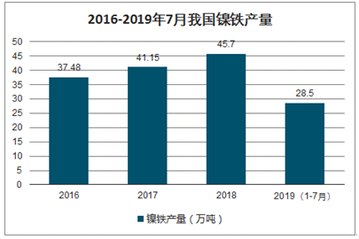 在需求增长的拉动下,世界不锈钢产量大幅增长,其生产中心已经从发达国家转入亚洲,特别是以我国为代表的亚洲新兴经济体。近年来。我国的镍铁已经逐渐替代电解镍成为不锈钢的主要原料,产量也呈现大幅增长的趋势。2017年,我国的镍铁产量是42.15万吨,到2018年我国的镍铁产量增长至45.7万吨,同比增长率达8.42%。2019年1-7月我国的镍铁产量为28.5万吨。