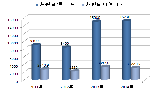 2012-2015年我国废钢回收规模及回收价值走势