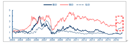 钴价与铜、镍价格关系(以2003年12月5日为基准点=1)
