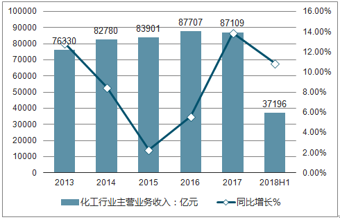 2018年上半年,我国化工行业规模以上企业实现主营业务收入37196亿元,上年同期主营业务收入为33553亿元,同比增长10.9%。