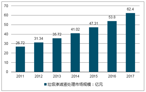 我国垃圾处理行业起步较晚,但随着我国各项环保政策陆续实施,行业市场容量已有明显提升。作为基石的垃圾渗滤液有望率先受益。2017年我国垃圾渗滤液处理市场规模达62.2亿元。