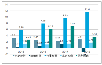 2015年以来,以永高股份、顾地科技、伟星新材、东宏股份、沧州明珠为代表的塑料制硬管行业上市公司的利润总额走势如下图所示,其中伟星新材2019年利润总额最高为11.60亿元,同比增加20.46%,另外顾地科技和沧州明珠利润总额较2017年均有所下降,顾地科技下降最快,2019年下降至-1.28亿元,同比减少191.51%,沧州明珠减少最多,从2017年7.03亿元减少至2019年3.52亿元,减少3.51亿元。