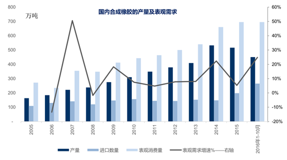 国内合成橡胶的产量及表观需求