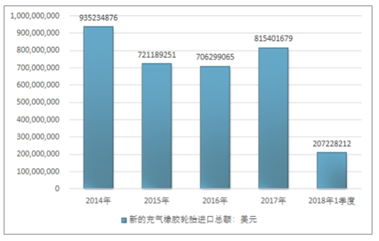 2016年我国新的充气橡胶轮胎进口总额706299065美元,2017年进口总额815401679美元;2019年1季度进口总额207228212美元。