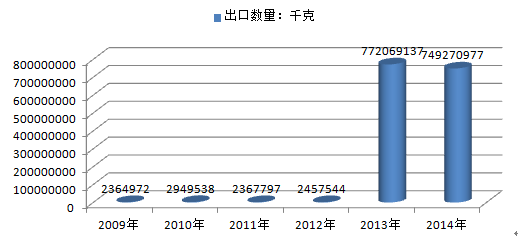 2013年我国甲醇出口数量为772069137千克,2014年我国甲醇出口数量为749270977千克。