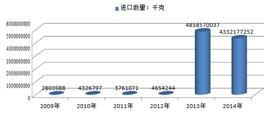 2013年我国甲醇进口数量为4858570037千克,2014年我国甲醇进口数量为4332177252千克。