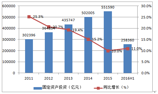 2011-2016H1中国固定资产投资及增长速度