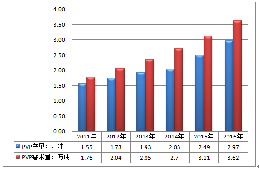 2016年,我国PVP行业产量约2.97万吨,行业消费了约3.62万吨,行业净进口量约0.65万吨。近几年我国PVP行业产销量情况如下图所示: