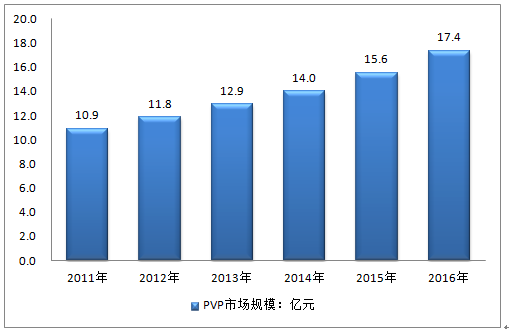 2016年我国PVP行业市场规模约17.4亿元,同比2015年的15.6亿元增长了11.54%,近几年我国PVP行业市场规模情况如下图所示: