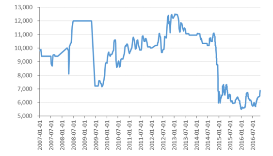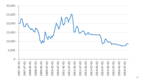 两大聚合物 PVP 与 PVME/MA 原料成本中 BDO 与顺酐均占比高达80%以上,BDO 受成本下降影响,价格自 2011 年 10 月以来持续下跌,从最高点 25000 元/吨跌至目前的 8600 元/吨,跌幅高达 65.60%;顺酐从最高点 12000 元/吨跌至目前的 6800 元/吨,跌幅高达 43.33%。