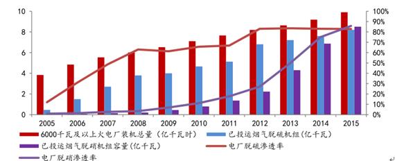 “十二五”期间,火电行业已基本完成脱硫脱硝设施的安装,截止到 2015 年底,我国 6000 千瓦及以上燃煤电厂的总装机量为 9.9 亿千瓦,脱硫和脱硝装机容量分别为 8.2 和 8.5 亿千瓦,渗透率分别达到 83%和 86%。