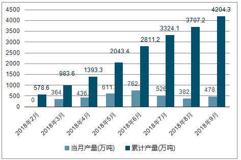 2018年2-9月中国原盐各月当月产量及累计产量走势