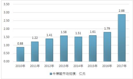 2018年中国牛磺酸行业市场规模约2.88亿元,同比2016年的1.79亿元增长了60.9%,近几年我国牛磺酸行业市场规模情况如下图所示: