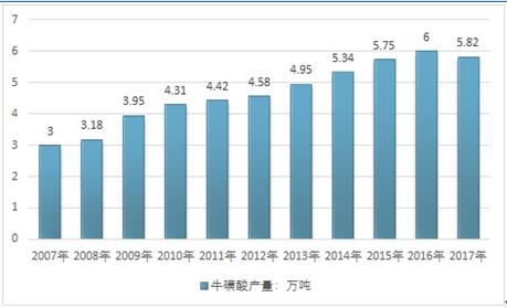 近几年,我国牛磺酸行业产量呈现缓慢增长态势,2018年受到环保压力影响,国内牛磺酸供应不足,产量5.82万吨,同比2016年的6万吨下降了3%。