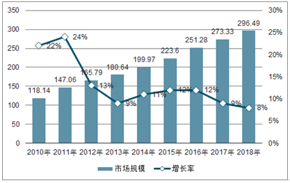 2010-2018年特种气体行业市场规模一直呈现稳定上升趋势,2019年已经达到296.49亿元,较2017年增长8%。