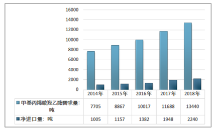 2014-2018年甲基丙烯酸羟乙酯需求量与净进口量
