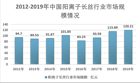2012年我国阳离子长丝行业市场规模94.7亿元,到2019年增长到了120.21亿元,近几年我国阳离子长丝行业市场规模情况如下图所示: