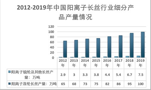2019年中国阳离子长丝行业产量107.5万吨,其中,阳离子涤纶长丝产量100万吨;阳离子锦纶及其他长丝产量7.5万吨。