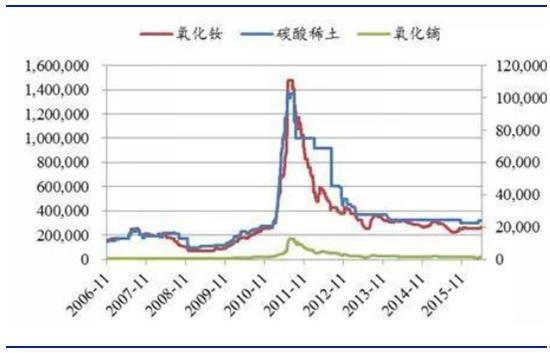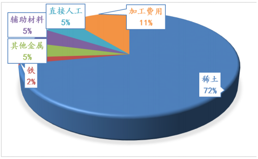 稀土材料成本占钕铁硼生产成本 70%以上。钕铁硼是以 Nd2Fe14B 化合物为基体,含有少量富钕和富硼相的永磁材料,其制作原料主要有硼铁,氧化镨钕和氧化镝等。稀土材料成本在钕铁硼的生产成本中占据 70%以上,因此钕铁硼的生产高度依赖稀土资源,其产品价格对稀土价格非常敏感。