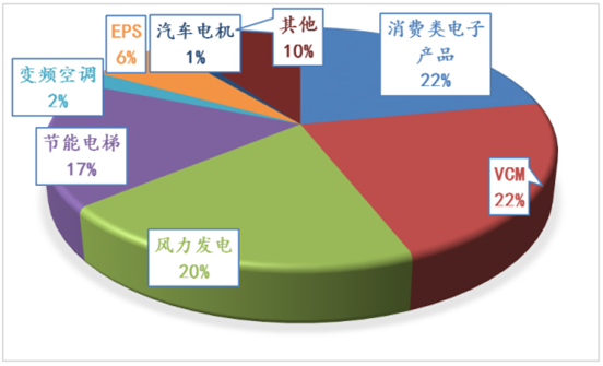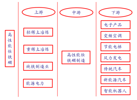 高性能钕铁硼磁体的行业产业链比较简单。上游是稀土冶炼业,包括重稀土冶炼业、轻稀土冶炼业、纯铁制造业及能源电力行业。中游是高性能钕铁硼生产商。下游大致包括电子产品、变频空调、节能电梯、风力发电、传统汽车、新能源汽车、智能机器人等领域。其中电子产品领域包括 VCM、手机、磁盘驱动器等。在这些领域中高性能钕铁硼大部分都是用作永磁电机的磁钢材料。