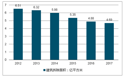 2012-2017年我国建筑拆除面积走势图