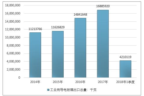 2016年我国工业用导电玻璃出口总量14841648千克 ,2017年出口总量16885920千克 ;2019年1季度出口总量4210119千克 。