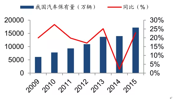 2012 年至 2014 年,我国汽车销量分别为 1931 万辆、2198 万辆和 2349 万辆,增速分别达到了为 4.2%、13.9%和 6.9%。汽车行业在经历了多年的高增长,销量突破 2000 万辆之后,我国汽车销量回归到了稳定增长的状态。2015 年我国销售汽车 2459.8 万辆,同比增长 4.7%,同时,我国汽车保有量达到了 1.72 亿辆,再创历史新高。
