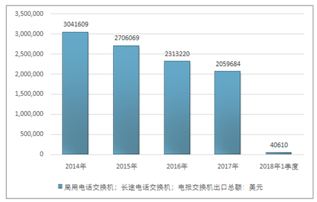 2016年我国局用电话交换机;长途电话交换机;电报交换机出口总额2313220美元,2017年出口总额2059684美元;2019年1季度出口总额40610美元。
