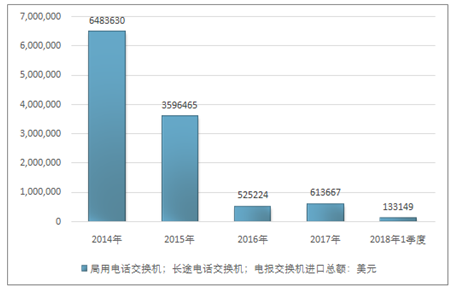 2016年我国局用电话交换机;长途电话交换机;电报交换机进口总额525224美元,2017年进口总额613667美元;2019年1季度进口总额133149美元。