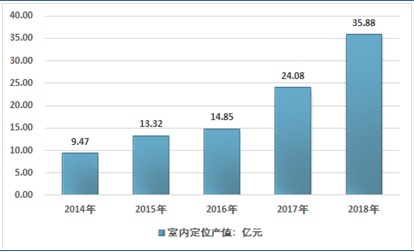 2018年我国室内定位行业产值约35.88亿元,同比2017年的24.08亿元增长了49%,近几年我国室内定位行业产值情况如下图所示:
