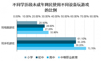 不同学历段未成年网民使用不同设备玩游戏的比例