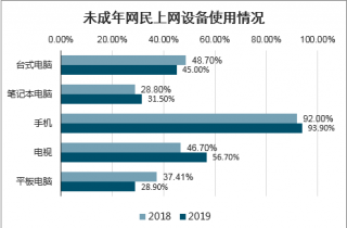 调查发现,未成年网民使用各类上网设备的比例,依次是手机(93.9%)、电视(56.7%)、台式电脑(45.0%)、笔记本电脑(31.5%)、平板电脑(28.9%)。未成年网民中,拥有属于自己的上网设备达到74.0%,其中自己有上网手机的为63.6%。