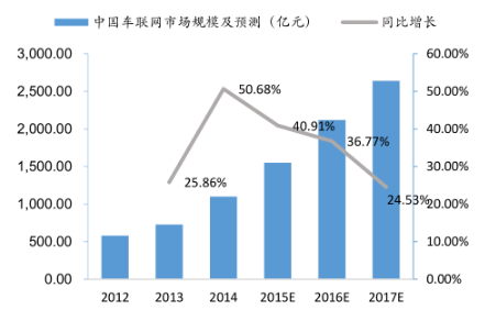 而据预测数据显示,2015 年中国车联网市场规模为 1550 亿人民币,到 2017 年将达到 2640 亿人民币,年复合增长率达到 35.41%。