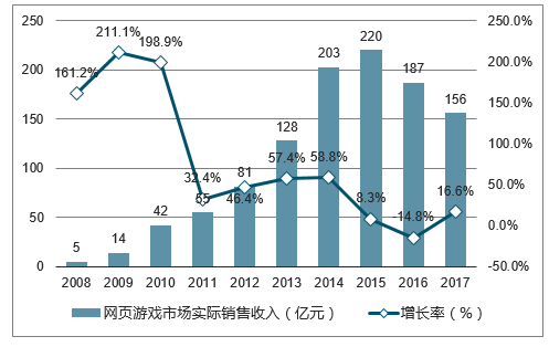 2008-2017年中国网页游戏市场实际销售收入及增速