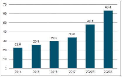 中国3D数字化市场规模为亚太区最大,市场规模4年内增长11亿元人民币,增长势头强劲。2014-201年中国3D数字化市场规模从22.6亿元人民币增长至33.8亿元人民币,CAGR 为10.58%。预计2017年-2023年以年均复合增长11.1%的速度高速增长,于2023年达到 63.44亿元。我国3D数字化市场规模为亚太地区最大,得益于庞大的制造业基础。