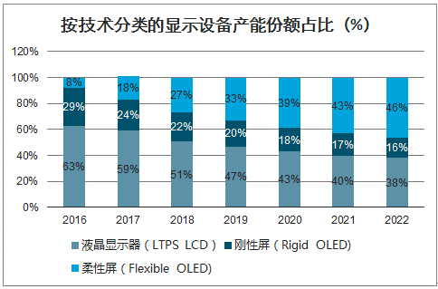 随着技术不断发展成熟以及相关下游应用产品需求量扩大,柔性屏在显示设备的产能份额占比不断提高,2018年全球柔性屏产能份额占比将达27%,预计2022年占比达到46%。