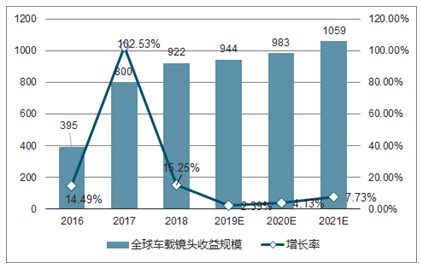 图表:2015-2019年全球车载摄像头行业市场规模及增速