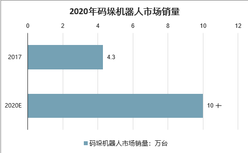 码垛机器人常用于仓储、码头、工厂等场所。据数据显示,2017年码垛机器人销量约为4.3万台,同比增长33%。未来,智能仓储的建立及智慧工厂的发展将带来码垛机器人的大规模应用,预计2020年市场销量将超10万台。